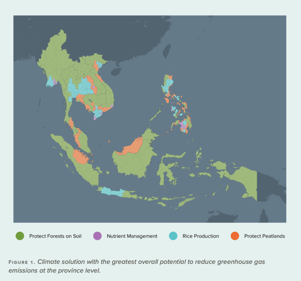 - Targeted interventions in high-priority areas can yield major emissions reductions. For example, protecting 20% of carbon-dense forests in Southeast Asia offers 83% of the carbon savings potential for forest protection across the region; 64% of emissions savings from improved rice production could be achieved on 20% of rice farms; and 80% of emissions savings from improved nutrient management would come from focusing on 20% of farms using excess fertilizers.
