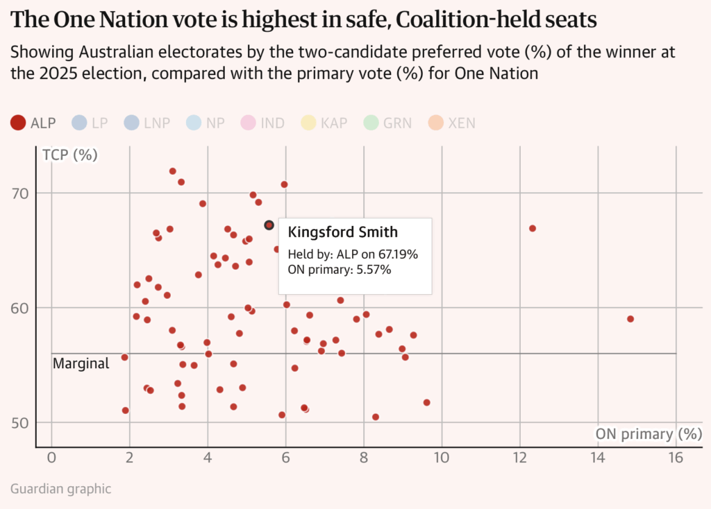 We can see this most clearly in the preference figures for seats like Ryan in the 2025 election, which ended up with a Greens versus Liberal contest. About 18% of One Nation voters preferenced the Greens over the Liberals:https://interactive.guim.co.uk/datawrapper/embed/oFLMF/1/?dark=false