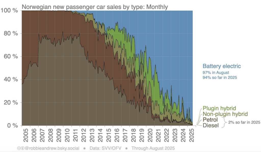 This is truly mind-blowing: Norway has gone from near-zero sales of non‑emitting battery electric vehicles to now close to 100% of all new passenger car sales—achieved in about 13 years.
