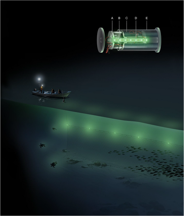 The design emerged from conversations in 2018 between the researchers and gillnet fishers who ply the waters off the southern coast of Baja California in search of fish such as yellowtail amberjack. What emerged was a small plastic cylinder packed with electronics, including thin-film solar cells and a battery that powered strips of flashing green LED lights. The buoyant light had a hollow tube through the middle, enabling fishers to string it to their nets like a bead on a necklace. Strung across the upper edge of the net, they resemble Christmas lights on the edge of a roof. The system held enough charge to power lights for five days without sun.
