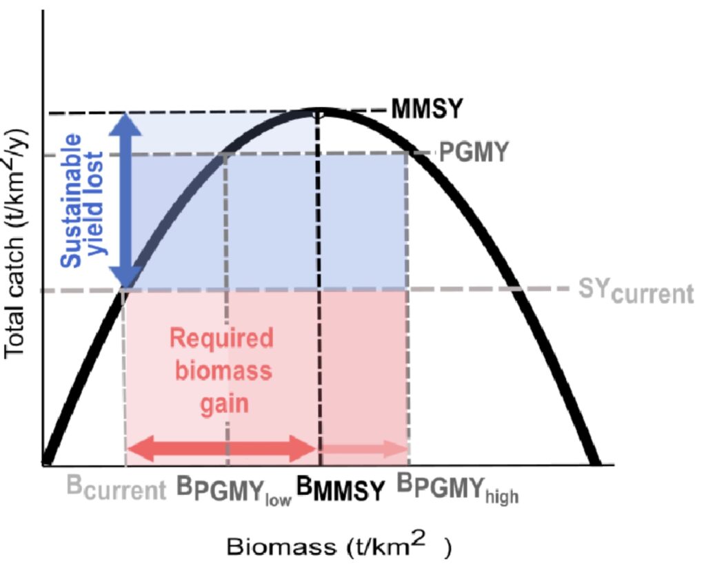 Figure 1| Theoretical relationship between sustainable yield losses and required biomass 116 gains in coral reef fisheries. Conceptual surplus production curve diagram exemplifying how to quantify (i) the sustainable yield lost from having fish assemblages below biomass levels aimed at maximizing sustainable production BMMSY (Bcurrent<BMMSY) and (ii) the required biomass increases to recover assemblages to either maximum production values (MMSY) or pretty good multispecies yields (PGMY). The x axis represents the standing fish assemblage biomass and the y axis the sustainable total catch or estimated surplus production for the whole multispecies assemblage. The solid line represents the expected surplus production along a gradient of biomass (assuming a Graham-Schaefer surplus curve for the multispecies assemblage, according to which MMSY is achieved at biomass levels corresponding to 50% of unfished biomass). SYcurrent is the expected long-term yield (i.e., surplus) from a hypothetical multispecies assemblage given its standing biomass (Bcurrent); BMMSY is the estimated biomass at which MMSY is achieved; and BPGMY are the estimated biomass at which PGMY are attained (below and above BMMSY: BPGMY,low and BPGMY,high, respectively). Note that we are not comparing current yields (i.e., how much is being caught on a reef) with potential maximum sustainable yields (i.e., how much could be caught sustainably if managing assemblages to maximize production) but instead how much sustainable yields could increase from their current hypothetical sustainable levels,