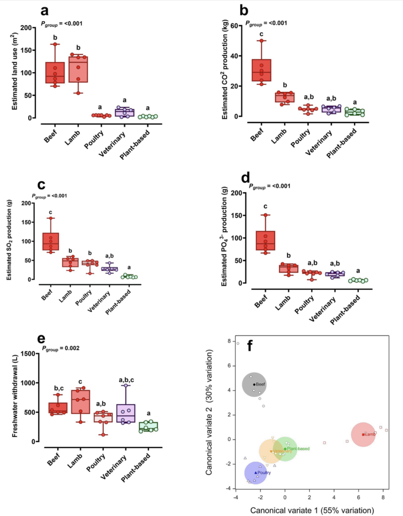 Figure 1. Estimated environmental impact of dry feeds for dogs according to feed type. (a–e) Individual data points and box-plots (line at median, box = first to third interquartile range, whiskers = min, max range) for estimates of environmental impact. Equations used to derive values for each feed are as described in Methods (Equation 1; land-use) or in Supplementary Equations 2–5. Type of meat used to produce ‘meat-based’ food presented for clarity. Veterinary diets were ‘renal’ and semi-synthetic; (f) multivariate analysis (canonical discriminant plot) with all feeds (n = 31) and all estimated environmental impact data (as standardised z-scores due to the marked differences in numbers) represented. Statistical differences: Pgroup = overall effect as analysed by ANOVA (df, 4); boxplots not sharing a superscript are statistically different at p < 0.05, as analysed by post-hoc testing (Tukeys t-test).