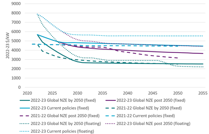 Figure 14: Projected costs for offshore wind – fixed and floating. Source: CSIRO GenCost 2022-23